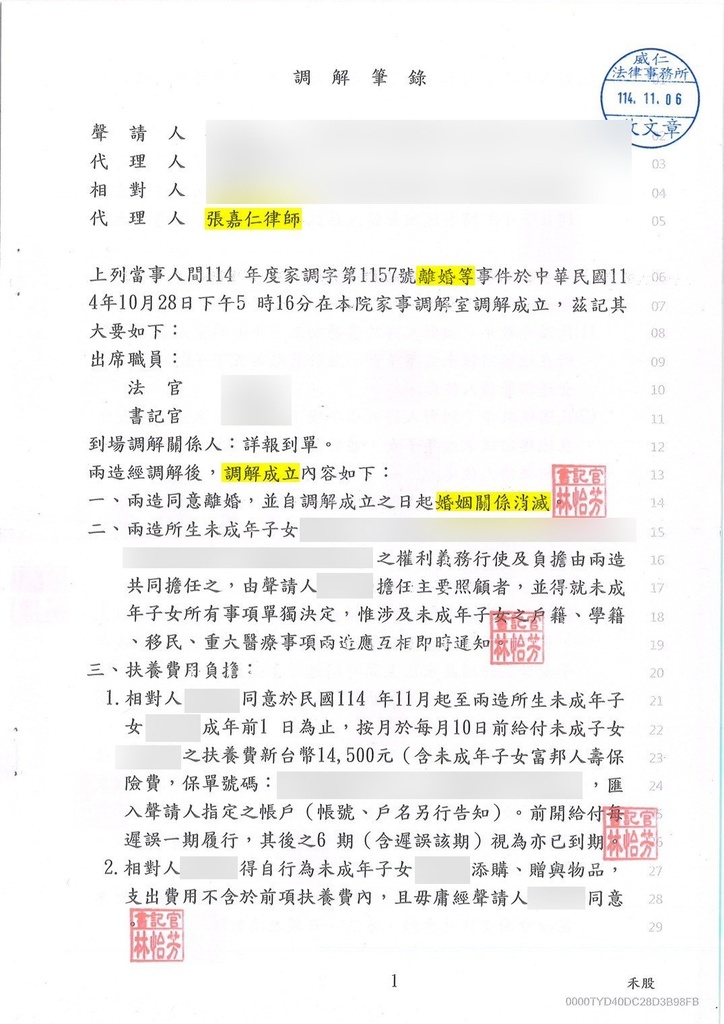 在具體且充滿誠意的方案提出後,原本態度強硬的妻子,也逐步接受共同監護的安排,並同意除每月 14,500 元扶養費外,不再另行要求其他項目支出。最終,雙方得以在調解階段順利達成共識,在理性與尊重中,為這段婚姻關係畫下句點,同時也替孩子保留一個相對穩定、可預期的未來。