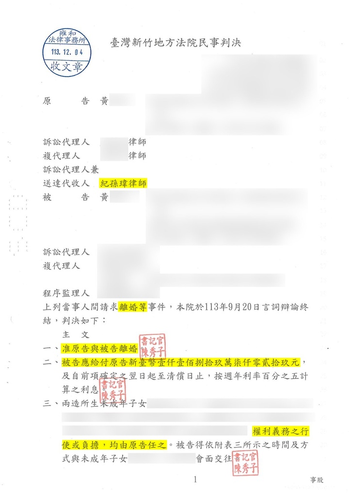 在財產分配方面,本案涉及金額龐大。妻子為降低應分配金額,主張自己對親友負有高達千萬元的債務,試圖以虛增消極財產的方式稀釋剩餘財產分配,藉此保留原先登記在其名下的財產。然而,紀律師逐一檢視其所提出的債務證明文件,發現內容前後矛盾,且缺乏合理性與真實性,成功揭露該債務為虛構。最終,法院未採信妻子的主張,認定該筆債務不成立,並判決妻子應給付小緣新臺幣11,897,029元,確保其財產分配權益不受侵害。