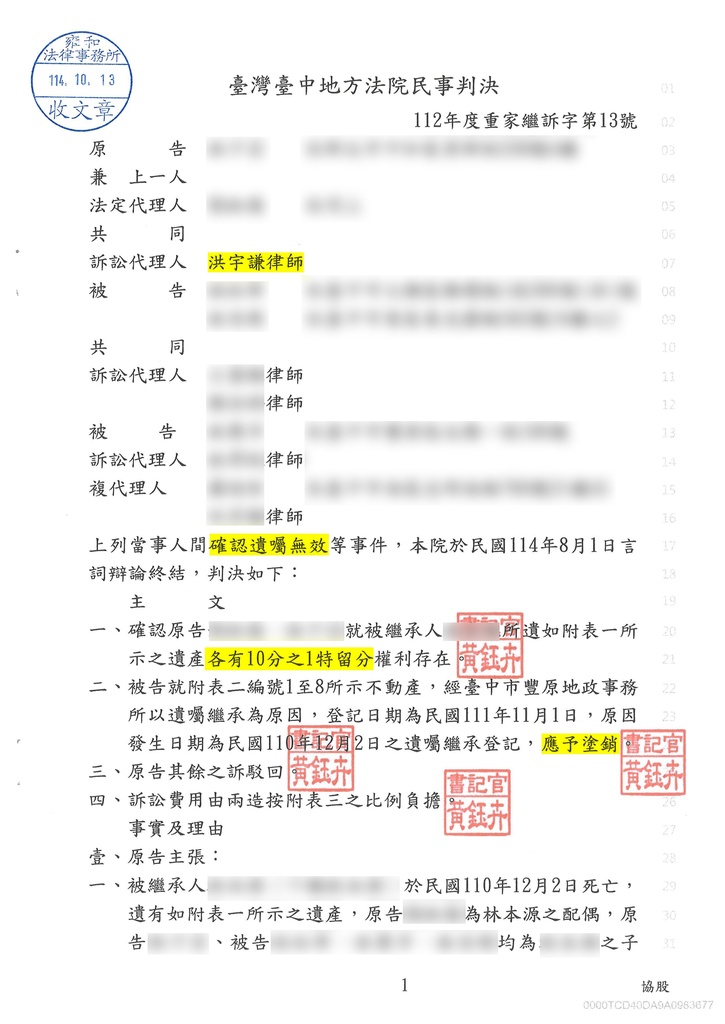 這場官司打得並不容易,在歷經多次庭審與證據補強後,法院終於採納了我們的見解,確認小蕎與女兒的繼承權利,並為再婚遺產爭議提供重要實務借鏡。本案中,法院判定原告勝訴,確認小蕎與女兒各自享有遺產十分之一的特留分,並命丈夫前婚姻子女塗銷其於臺中市豐原區8筆不動產的遺囑繼承登記;先位請求部分則駁回,訴訟費由五方當事人平均負擔。