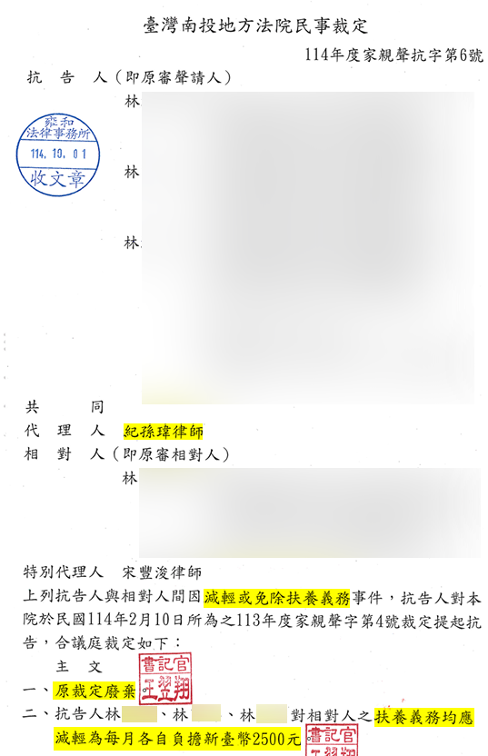 最終,法院採納紀律師的主張,認定父親過往未盡扶養義務的情形明確,符合《民法》第1118條之1所稱之重大事由,撤銷原本的扶養費裁定。三兄妹原須共同負擔每月近新臺幣30,000元的費用,成功降低為每人每月僅需負擔2,500元。